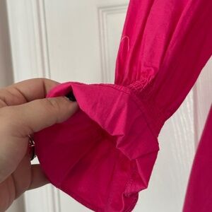 Excellent condition Pomander Place Tuckernuck top, Size Medium. Bright Pink. Poplion style. Ruffle sleeves. This blouse from Pomander Place features a relaxed fit with a ruffled V-neckline and subtle puff sleeves, all in a charming pink hue. The lightweight fabric and modern silhouette make it ideal for both casual and dressy occasions.