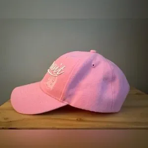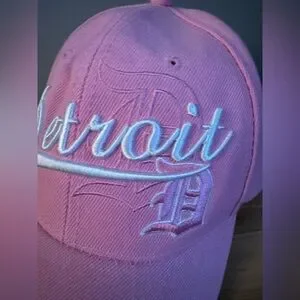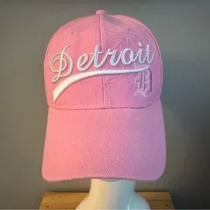 Stylish pink cap featuring 'Detroit Tigers” baseball logo. Perfect for casual outings.