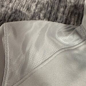 Light gray pullover with quarter-zip design. Features Under Armour logo. Ideal for active wear. Has large front pocket.