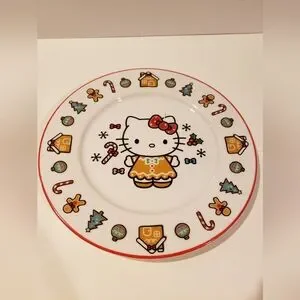 Charming Hello Kitty Christmas plate with festive designs. Features Hello Kitty in a gingerbread outfit surrounded by holiday icons.