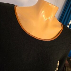 THML dress. The bodice and sleeves are soft black knit, Contrasting cream with black damask floral print cascade down the sides, delicate brown "faux leather" trim around the neckline adds a subtle, refined detail.