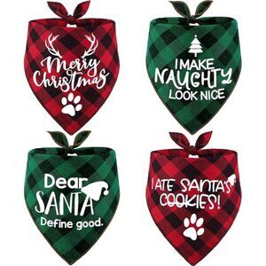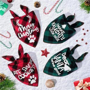 🧿UNIQUE HOLIDAY PATTERN DESIGN: This dog Bandana for dogs adds unique printing slogan for Christmas to the original classic lattice pattern design, which full of festive atmosphere. Four bandanas has different holiday slogans on front side, but the never out of date classic lattice on back side. You will get 8 style in total actually, and you can change the look of your puppy every christmas or daily life and not repeat. A set of essential ideal holiday dog bandana.