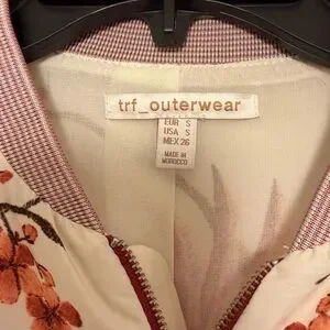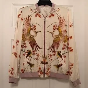 So gorgeous!! TRF Outerwear by Zara satin bomber jacket in a women’s size small. This is a lightweight and lightly lined zip up jacket featuring beautiful cherry blossom and cranes all over the front and back. Jacket is a light beige color. Excellent used condition. Super unique item!!