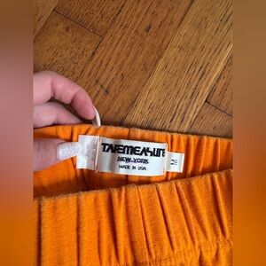 This is a classic pair of late 80s-90s stirrup pants. Made of a bright orange cotton blend they are high waisted with an elastic waistband. Made in USA by the brand tape measure. Marked a size medium. In good vintage condition with no major flaws to note.