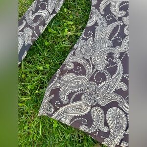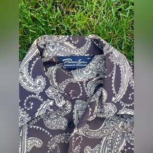 This is a true 1970s vintage paisley disco shirt in a silky acetate/nylon blend. Features an allover swirling paisley print in a soft cream against a grey/ brown background, with a pointed collar and slim, tailored cut typical of 70s menswear.Button-front style with long sleeves and a straight hem.
