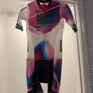Vibrant cycling suit with pink, blue, and black accents. Features logos and a sleek design.