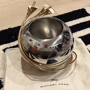 Curvy, architectural calla lilies—cast in shining brass and snowy enamel—gird an elegant vase crafted in gleaming stainless steel.