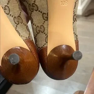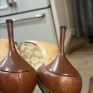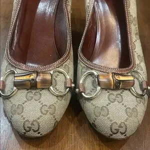 Elegant Gucci loafers in tan canvas. Features signature gold accents. Perfect for stylish outings.Very good condition