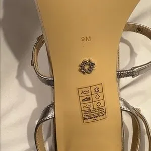 In excellent used condition!! Tiniest signs of wear shown in photos, look basically new. Gorgeous two tone silver straps with gold studs, metallic 3” block heel, adjustable ankle strap. Size 9