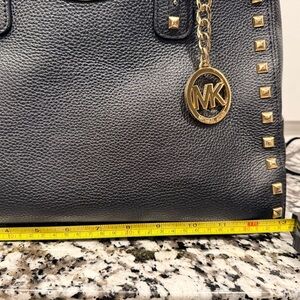 Stylish black satchel with gold stud detailing. Features iconic MK charm. Perfect for any occasion. Beautiful bag.