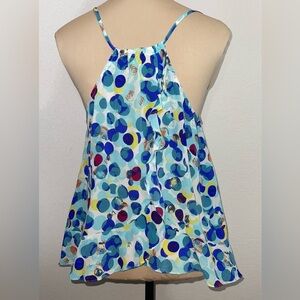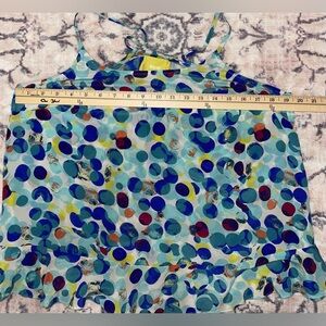 The Zabella silk cami by Maeve for Anthropologie features a crew neckline, with adjustable spaghetti straps, multi-colored circle/spot design and a ruffled peplum-like hemline. The back features a racerback and beautiful ruffle detail. Color is called