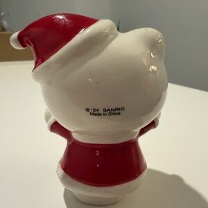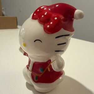 Add some festive cheer to your holiday decor with this adorable Hello Kitty Christmas figurine! This collectible features Hello Kitty in a cute Santa outfit, complete with a red hat with white polka dots and a matching red jacket with a painted string of colorful Christmas lights.