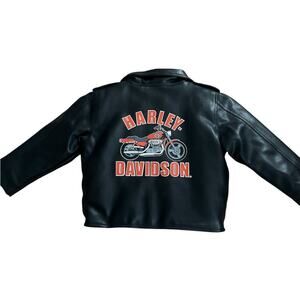 Classic black jacket featuring Harley-Davidson logo. Striking orange and white details with motorcycle graphic. In like new condition