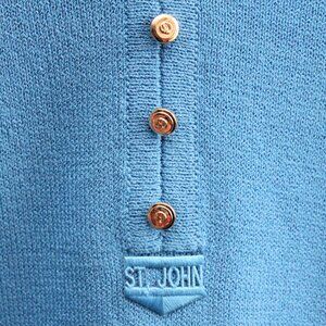 Pullover sweater with gold St. John Buttons and 'St. John' embroidered at the bottom of the buttons.