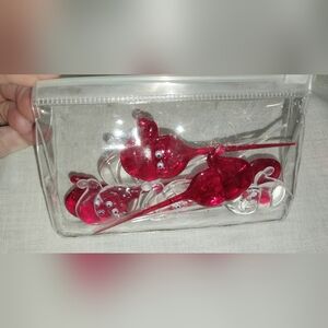 New with tags never used Mud Pie plastic Christmas tree dip cup with spreader and red bow and also new on packaging never used Crate and Barrel 8 plastic Santa hors d'oeuvre picks with googly eyes. Dip cup is 6x7x2 in. Santa picks are approximately 3.5 in Long. Total weight 15.5 oz