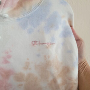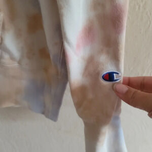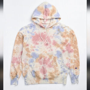 Mix it up with the pink, blue, and orange sun wash hoodie from Champion. This sweatshirt features a white base colorway with blue, pink, and orange blotches throughout, giving a uniquely colorful look.