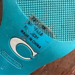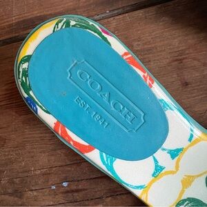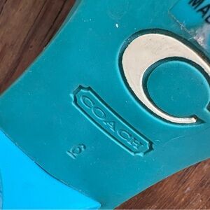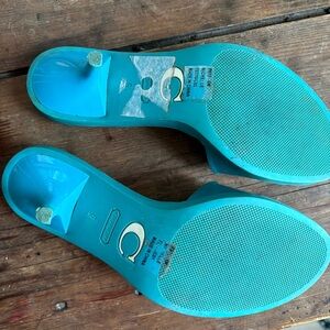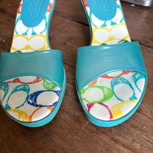 Super cute jelly sandals from Coach. Colorful logo soles with 2 inch heels and jelly arch strap. Size 6