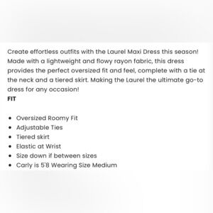 Create effortless outfits with the Laurel Maxi Dress this season! Made with a lightweight and flowy rayon fabric, this dress provides the perfect oversized fit and feel, complete with a tie at the neck and a tiered skirt. Making the Laurel the ultimate go-to dress for any occasion!