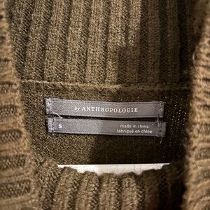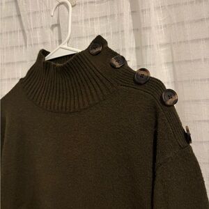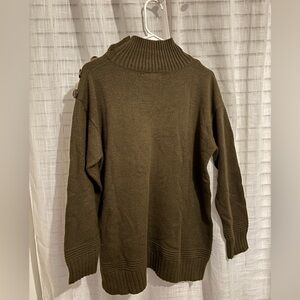 Cozy meets chic with this gorgeous olive green sweater from Anthropologie. Features a ribbed mock neck, cuffs, and hem for a flattering fit, plus stylish oversized buttons along the shoulder for a unique touch. Side slits add comfort and easy movement.