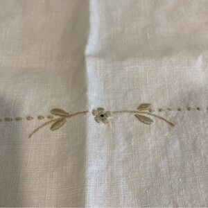 This small table runner features tan embroidery with floral and dot designs on an off-white fabric.