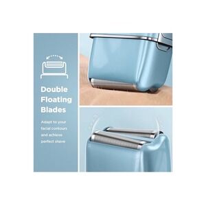 Men's portable electric shaver in a striking blue finish. This reciprocating shaver is designed for efficient grooming with a digital display indicating battery life and RPM. Features double floating blades that adapt to facial contours for a close shave. Enjoy the convenience of USB charging, with a full charge taking just 2 hours. Offers an impressive 40 days of standby time on a single charge.