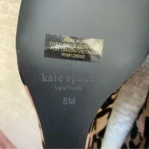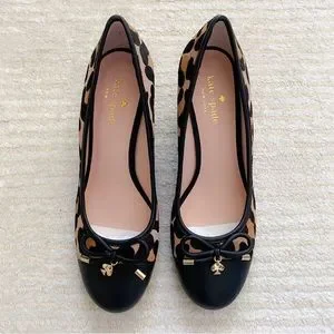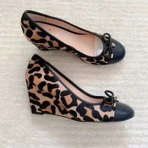 Kate Spade Kacey leopard wedges. Leopard haircalf print wedge in blush/brown. Slip-on style with a round toe, leather lining/insole/outsole. Wrapped chunky heel approximately 3”.