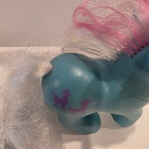 Discover a charming piece of 80s nostalgia with this vintage blue My Little Pony figure. Adorned with two adorable purple poodle symbols on its side, this pony boasts a flowing white mane and tail with delicate pink streaks, bringing a playful touch to any collection. Its big, expressive blue eyes and gentle demeanor evoke cherished childhood memories. This delightful pony is perfect for display on a shelf, as a whimsical addition to a child's toy collection, or as a nostalgic accent piece for a retro-themed room.