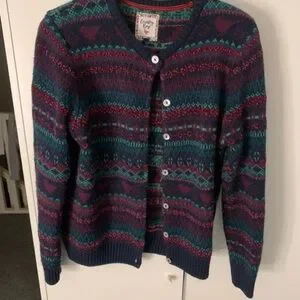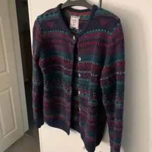 Stay warm and stylish with this cozy knit sweater. Featuring a vibrant mix of blue, pink, and green, it's perfect for any casual outing.