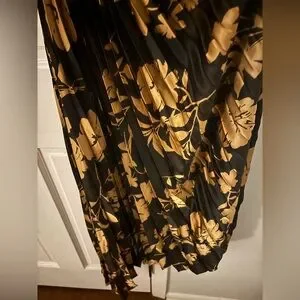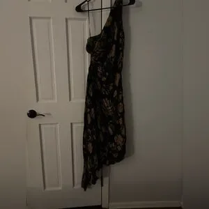 Step out in style with this elegant black and gold floral one-shoulder dress with side keyhole. Perfect for any occasion, this dress combines sophistication with a modern twist. The pleated design adds a touch of flair, making it a must-have for your wardrobe. Size medium this dress is absolutely gorgeous!!! Never worn brand new. Stock photos for fit and style purposes only.