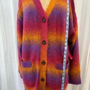 Stylish ombre cardigan featuring a vibrant blend of pink, purple, and yellow hues. This cozy and fashionable piece is perfect for layering and adding a pop of color to any outfit. Its soft material ensures comfort, making it suitable for various occasions. New condition.