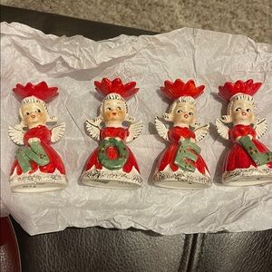 Add classic holiday charm to your home with this adorable vintage set of four ceramic angel figurines, each holding a letter to spell “NOEL.” The angels feature sweet hand-painted details, red dresses, white wings, and soft pastel green letters accented with holly. Each figure has a flower-shaped halo and charming retro facial expressions typical of mid-century holiday collectibles. Set of 4 vintage NOEL Poinsettia Angels Candle Holders Napco #1628. Each angel has a poinsettia flower on top of head were slim candle goes dressed in red each holding a letter that spells out NOEL. On bottom is blue & white made in Japan paper sticker with 1628 Measures 3.75" Tall. Condition is good but the E angel wings has been repaired on the left tip. Beautiful holiday treasure. Item is from a pet and smoke free home.