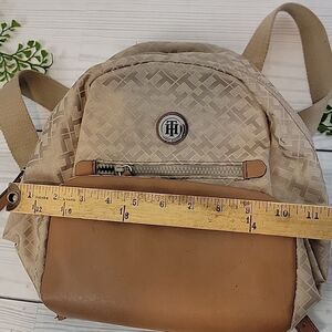 Signature printed Tommy mini backpack for your in-the-go items. Adjustable straps, an exterior front zip pocket, and extra inside organizer pockets. Great pre-owned condition with normal signs of use, including tiny marks on the bottom. See pictures.