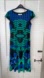 Joseph Ribkoff fit and flare scoop neck, cap sleeve dress. This pullover dress has a drop waist and is lined at the top. The abstract pattern is a bold blue, green and black with primarily triangles, diamonds, and circles. The removeable belt is not included. This material is stretchy and smooth. In excellent pre-loved condition.
