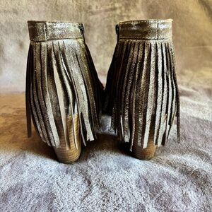 Chic metallic ankle booties with fringe detail. Perfect for a bold fashion statement.