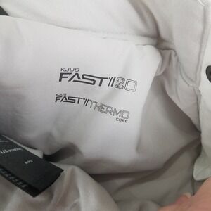 KJUS FAST 120 ski snowboard pants in white. These insulated pants are designed for performance on the slopes, offering waterproof protection and thermal core technology. Featuring zippered pockets for secure storage and a comfortable fit ideal for winter sports. Perfect for a day of skiing or snowboarding.