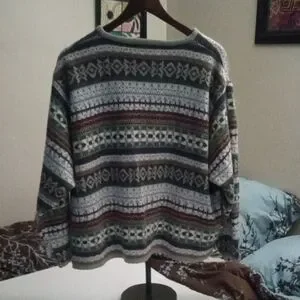 Stylish cardigan with intricate patterns. Features a mix of colors for a unique look. Perfect for layering.