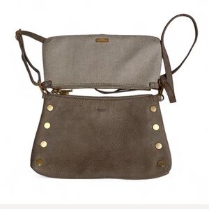 Discover the perfect blend of style and functionality with this elegant grey leather crossbody bag. Featuring a sleek design and gold accents, it's ideal for any occasion. The two in one gives options and lots of storage. Clean interior. Minor wear and tear on suede and hardware.