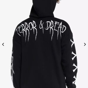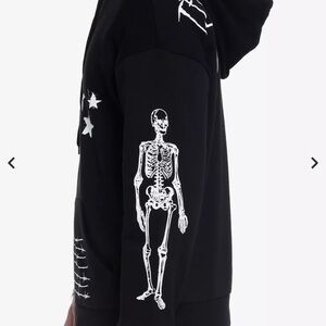 Elevate your plain black hoodie with some art! This one features punk-inspired designs throughout like barbed wires, skulls and stars. Comes with a front zipper closure, kangaroo pockets and a drawstring hood.