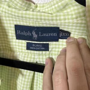 This Ralph Lauren Blake button-down shirt features a timeless green and white gingham check with the iconic embroidered pony logo. Soft 100% cotton fabric with a relaxed fit, perfect for dressing up or wearing casually. In excellent condition with no stains or flaws.