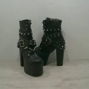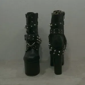 ACCENTS: 5 1/2" heel, a 3" platform, lace-up front, and wrap-around buckled straps with spikes and a heart O-ring, Vegan Leather,