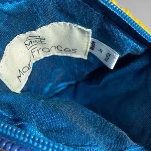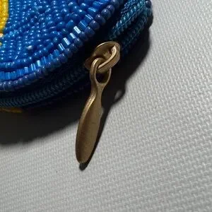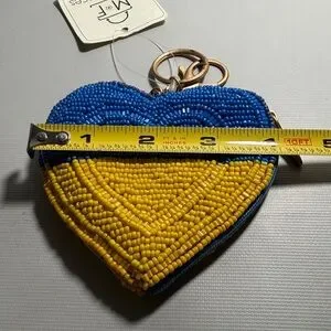 Mary Frances Blue and Yellow Beaded Heart Coin Pouch. Please see photos for measurements. Smoke-free and pet-free environment. Charming heart-shaped keychain with blue and yellow beads. Perfect for adding flair to your keys. Please note there is some tarnish on keys O-ring. The pouch has never been used.