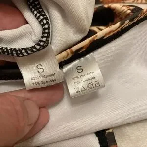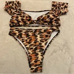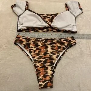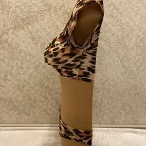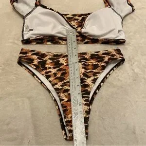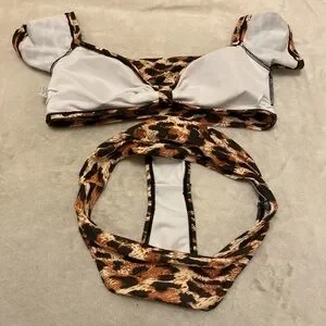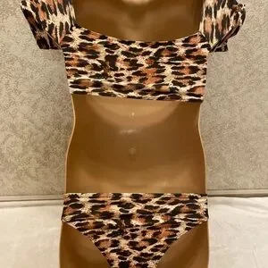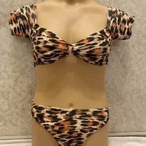 The colors are kind of a creamy yellowish beige with coppery brown and black in an animal print. The bottoms are more of a high waisted cheeky style. The top has little sleeves. In between the cups is a small strap that makes it look almost like a bow. Includes padded inserts, however they are crinkled from storage. Measurements are included.🤎 sold as pictured. Color may vary, depending upon your screen settings. May wrinkle during shipping.🖤Bin 59–10