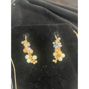 This delicate statement necklace and matching dangle earring feature resin beads in colors of coral, blue, and pale blue/white. Can be used for casual wear or to dress up an outfit!