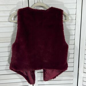 Stylish red faux fur vest. Sleeveless design. Perfect for layering.