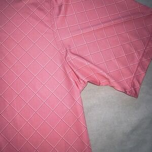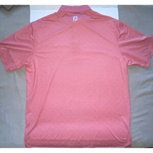 This FootJoy Men's Polo Shirt in size XL features a salmon and white diagonal plaid print with an embroidered Black Hawk logo accent on the left shoulder. Made of a breathable knit fabric blend of polyester and spandex, this short sleeve polo has a collared neckline with a button closure and a regular fit. Suitable for all seasons, this casual polo shirt is ideal for outdoor sports activities like tennis, walking, and golf, offering both style and comfort for the wearer on the course or off.
