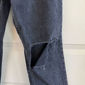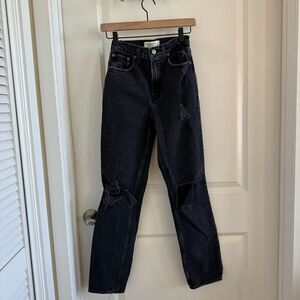 Abercrombie Ultra High Rise 90s Straight Jean size 00. Vintage inspired straight leg look with intentional distressing throughout including holes in the knees. In excellent condition.