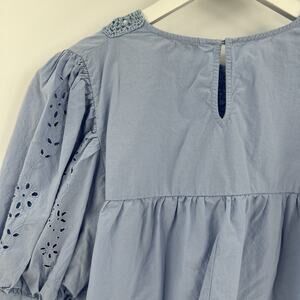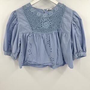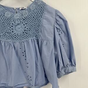 Zara Blue Cotton Top Crochet Eyelet Lace Floral Cutout Puff Sleeve Size Small