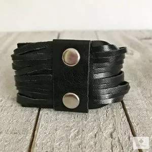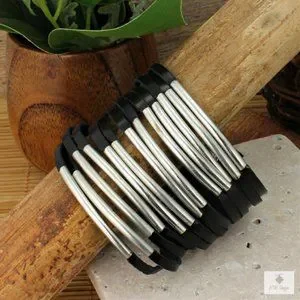 Black Leather & Silver Bar Cuff Bracelet. This cuff bracelet features 13 black leather strips with silver metal bars. Closes with adjustable snaps.