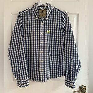 Stay effortlessly stylish with this Hollister men’s (or boys') long sleeve checkered shirt in a classic blue and white pattern.