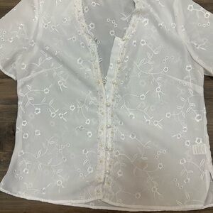 Sheer white shirt with floral embroidery. Button-down style. Lightweight and elegant.